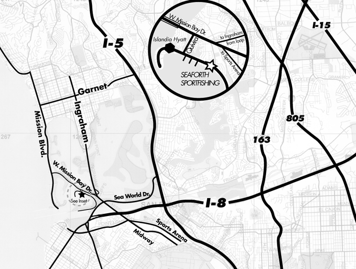 I-5 to Sea World Drive exit. West on Sea World Drive. 1/4 mile past Sea World entrance to West Mission Bay Drive. Stay to right. Proceed through traffic loop to first stoplight. Left at stoplight onto short access road. Left at end of short access road onto Quivira Road. Fourth building on the right.
